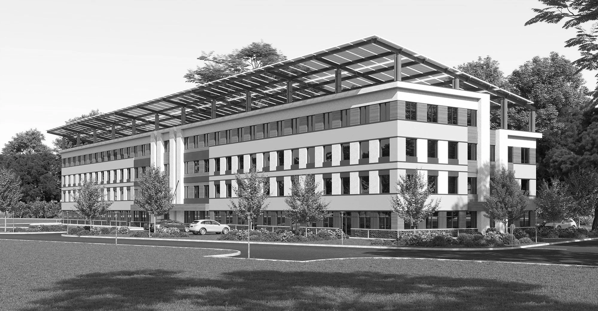 An aerial view of a modern three-story building with solar panels on the roof, surrounded by a parking lot with several cars, trees, and a distant industrial area under a partly cloudy sky.